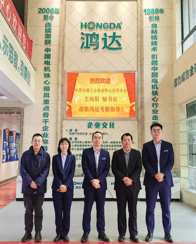 2023年12月9日,中国电器工业协会铁心应用分会秘书长王向阳一行到会员单位——宁波鸿达电机模具有限公司(简称宁波鸿达)调研,并与宋红杰董事长交流了鸿达EB549快速自粘结铁心技术及发展趋势,对我国自粘结电机铁心技术的推广应用进行了全产业链的探讨。